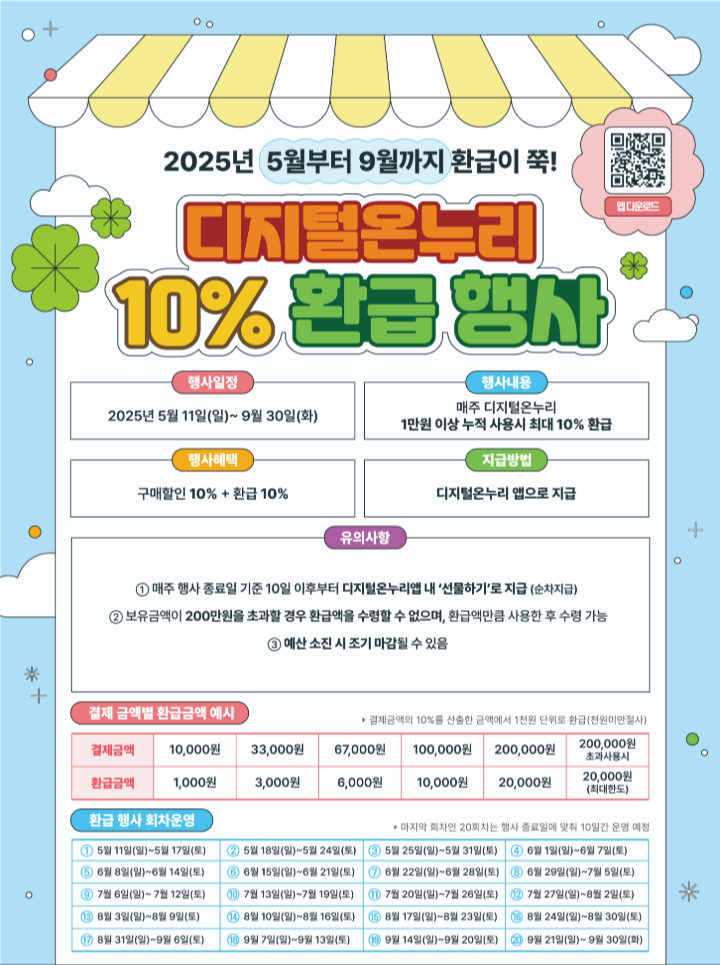 2025년 5월부터 9월까지는 디지털 온누리 환급 이벤트가 시행 중이며, 사용액의 최대 10%를 다시 상품권으로 돌려받을 수 있다. 예를 들어, 한 달간 10만 원을 사용했다면 최대 1만 원까지 환급 받을 수 있다는 의미다.