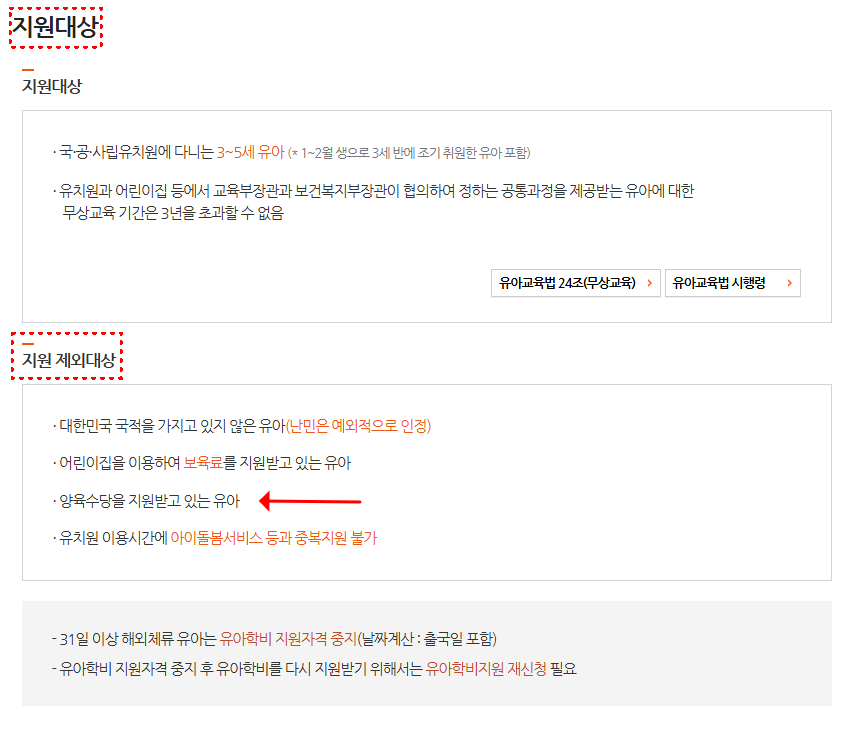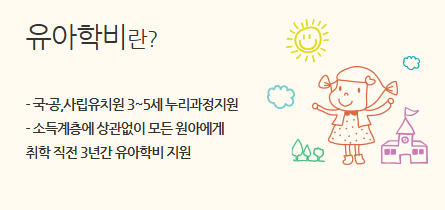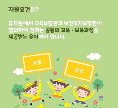 · 국·공·사립유치원에 다니는 3~5세 유아 (* 1~2월 생으로 3세 반에 조기 취원한 유아 포함) · 유치원과 어린이집 등에서 교육부장관과 보건복지부장관이 협의하여 정하는 공통과정을 제공받는