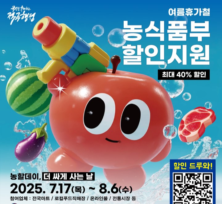 2025년 7월 17일부터 8월 6일까지 3주 동안 진행되는 여름 휴가철 농축산물 할인 지원 사업은 소비자들에게 국산 농축산물을 최대 40% 할인된 가격에 제공하는 정부 주도 프로그램입니다.