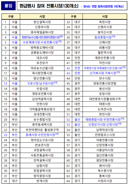 행사에 참여하는 전통시장은 서울의 광장시장, 망원시장, 통인시장, 부산의 부전시장, 국제시장, 대구의 서문시장, 광주의 양동시장, 수원의 못골시장 등 각 지역을 대표하는 시장들입니다. 환급을 받기 위해서는 반드시 해당 기간 내 전통시장 내 지정 부스에서 당일 영수증을 제출해야 하며, 구매품목은 국산 농축산물에 한정된다는 점을 꼭 유의해야 합니다.