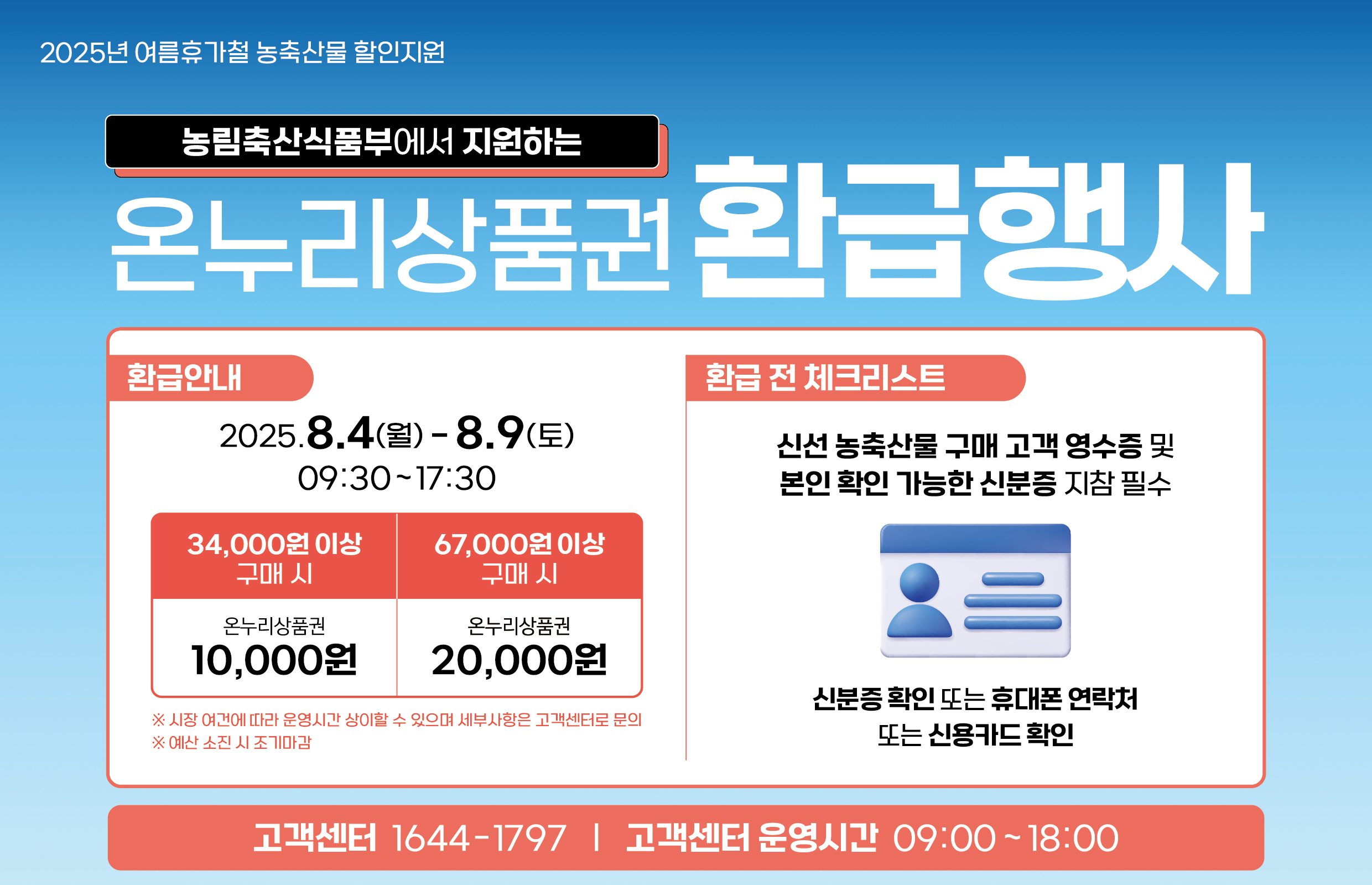 이처럼 2025년 여름, 국산 농축산물 할인 행사와 온누리상품권 환급 제도는 가계 지출 부담을 줄일 수 있는 실질적인 기회입니다. 다양한 유통채널에서 폭넓게 진행되는 만큼, 미리 행사 기간과 참여처를 확인하고, 현명한 소비로 더 풍성한 여름을 보내시기 바랍니다.