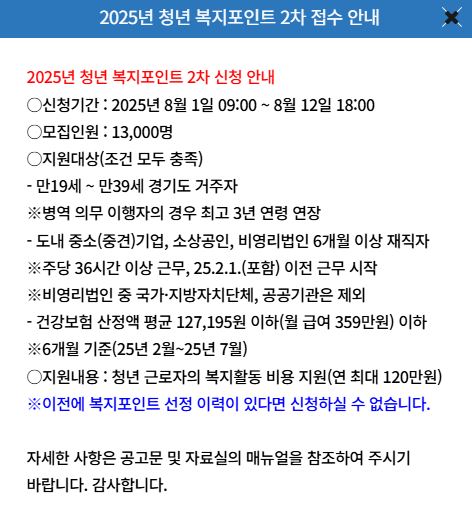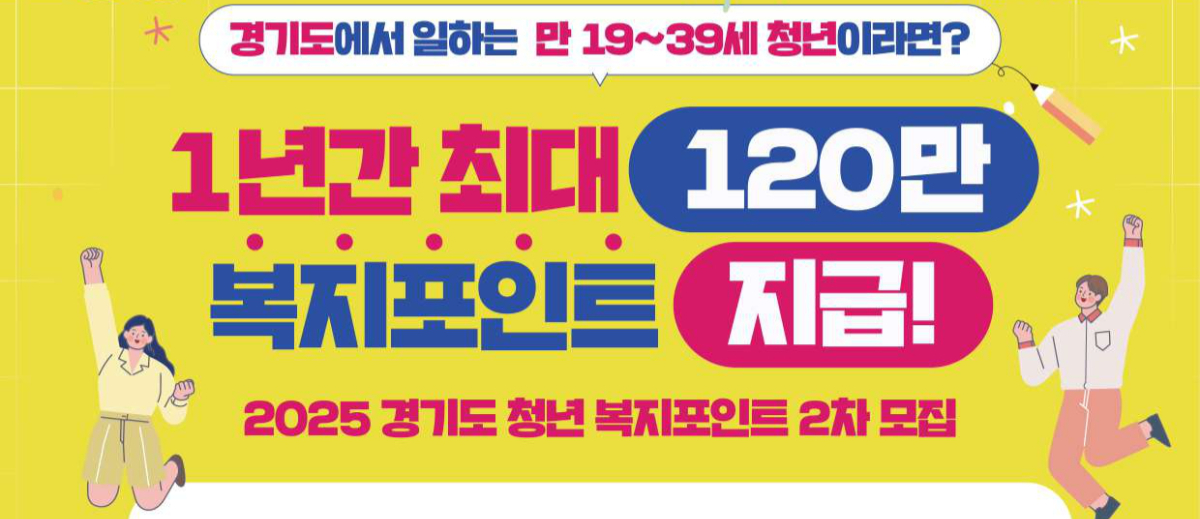 경기도가 도내 청년들의 복지 향상을 위해 청년 복지포인트 지원사업 2차 참여자 모집에 나섰습니다. 총 1만 3000명을 신규로 선발하며, 1년 동안 총 120만 원 상당의 복지 혜택이 제공될 예정입니다. 신청 대상, 신청 방법, 사용 방식 등 자세한 내용을 아래에 정리했습니다.