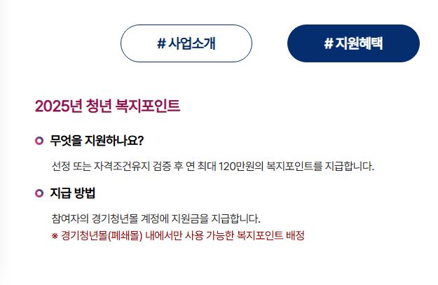 청년 복지포인트 사업은 경기도 청년 노동자의 삶의 질을 높이고 중소기업 인력난을 해소하기 위한 복지지원 제도입니다.