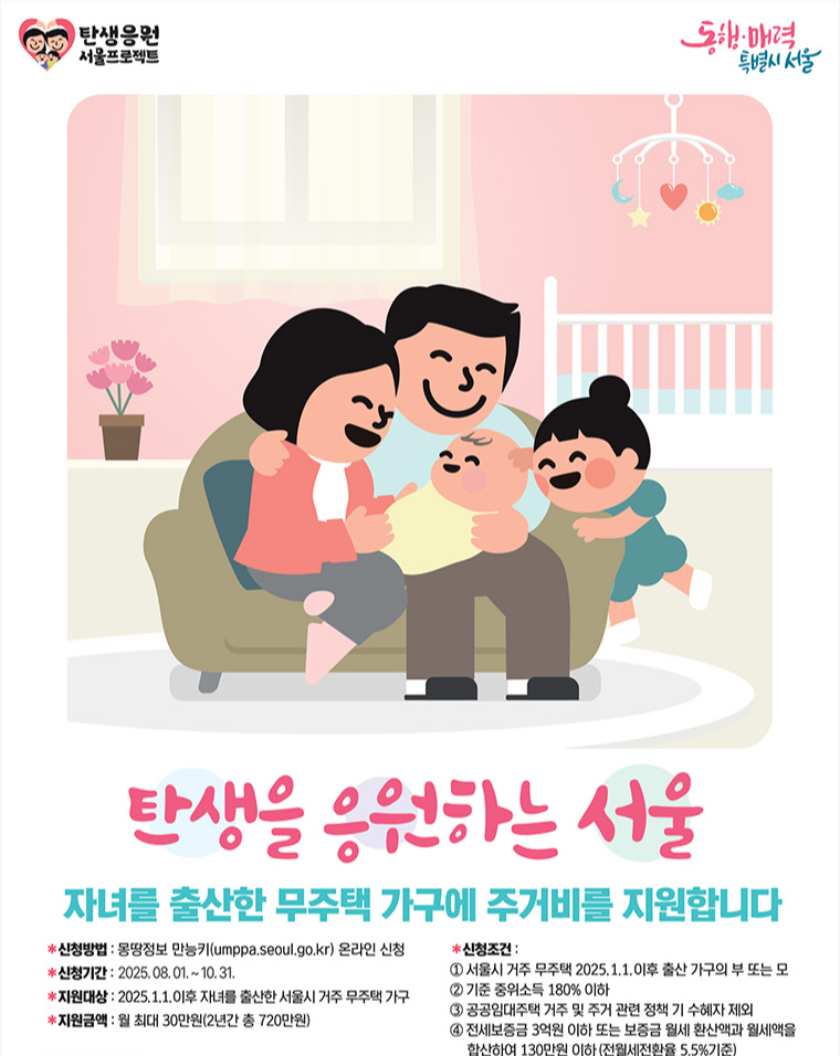 해당 사업은 2025년 1월 1일부터 10월 31일 사이 자녀를 출산한 서울시 거주 무주택 가구를 대상으로 하며, 오는 10월 31일까지 온라인 플랫폼 몽땅정보만능키 를 통해 신청을 받습니다.