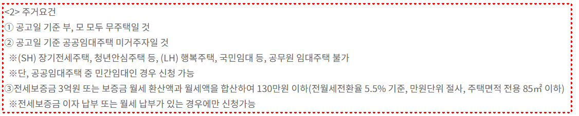 지원 대상은 기준 중위소득 180% 이하 가구로, 임차 주택의 경우 전세는 3억 원 이하, 월세는 환산액 포함 130만 원 이하 조건을 충족해야 합니다.