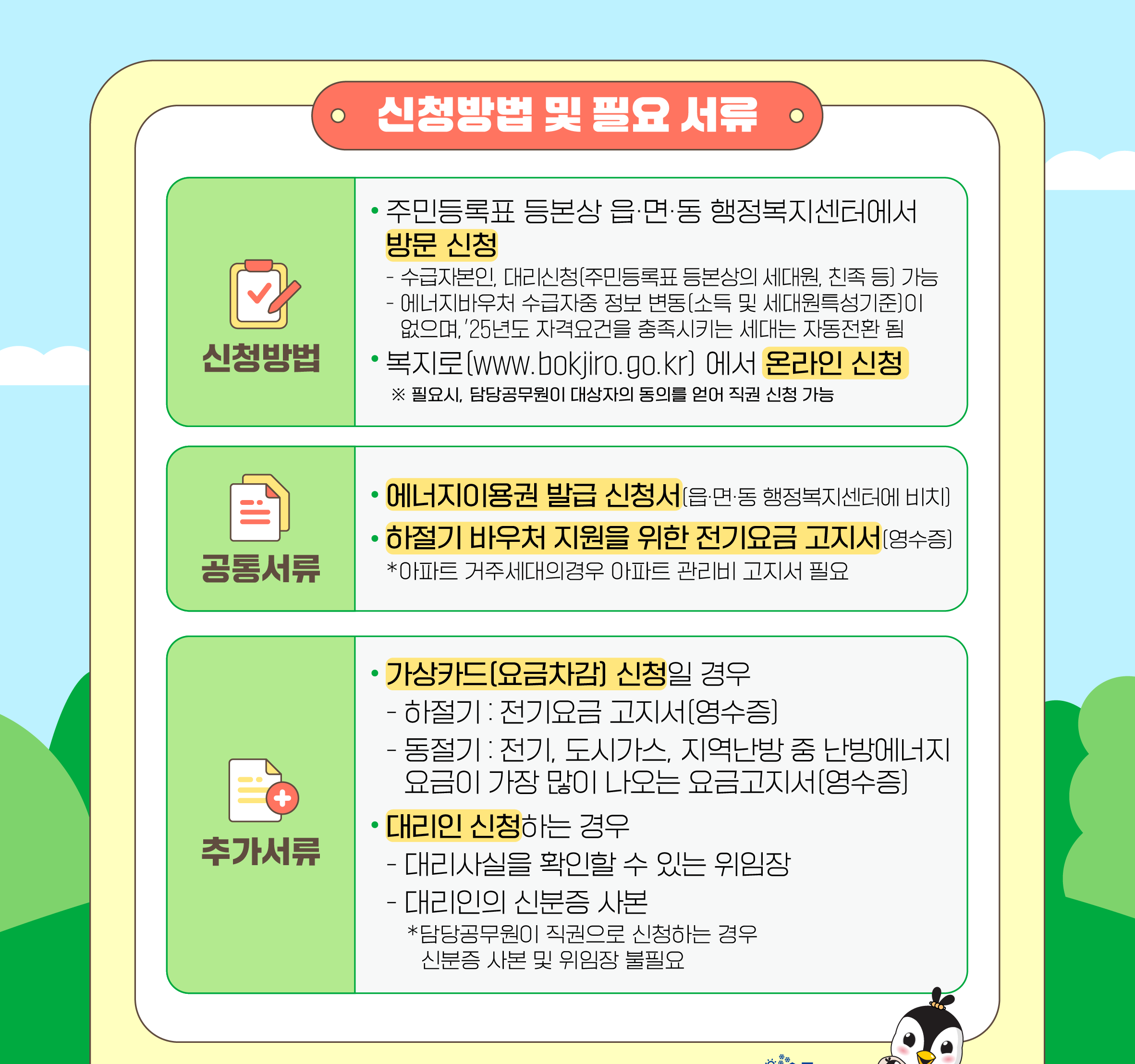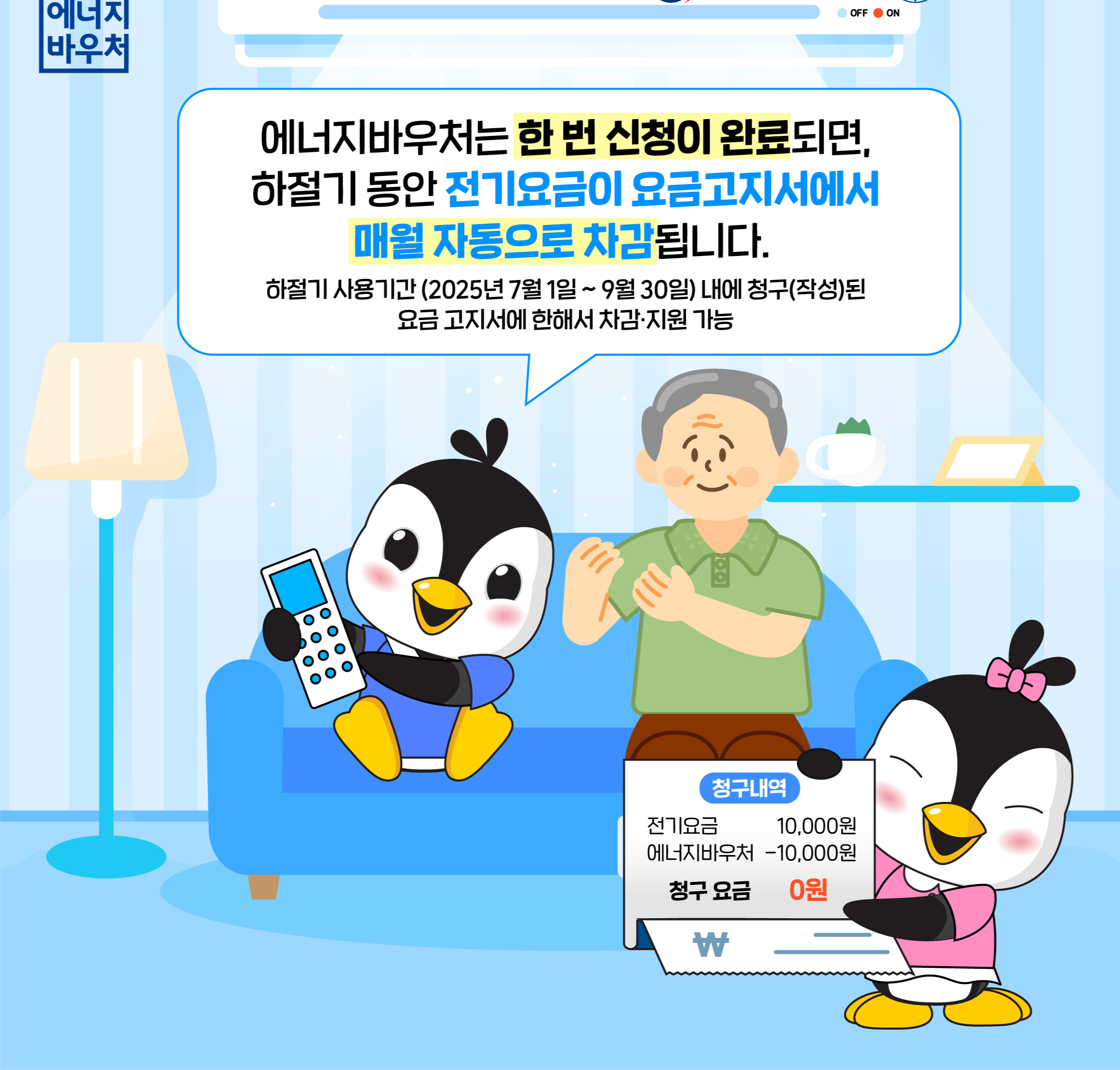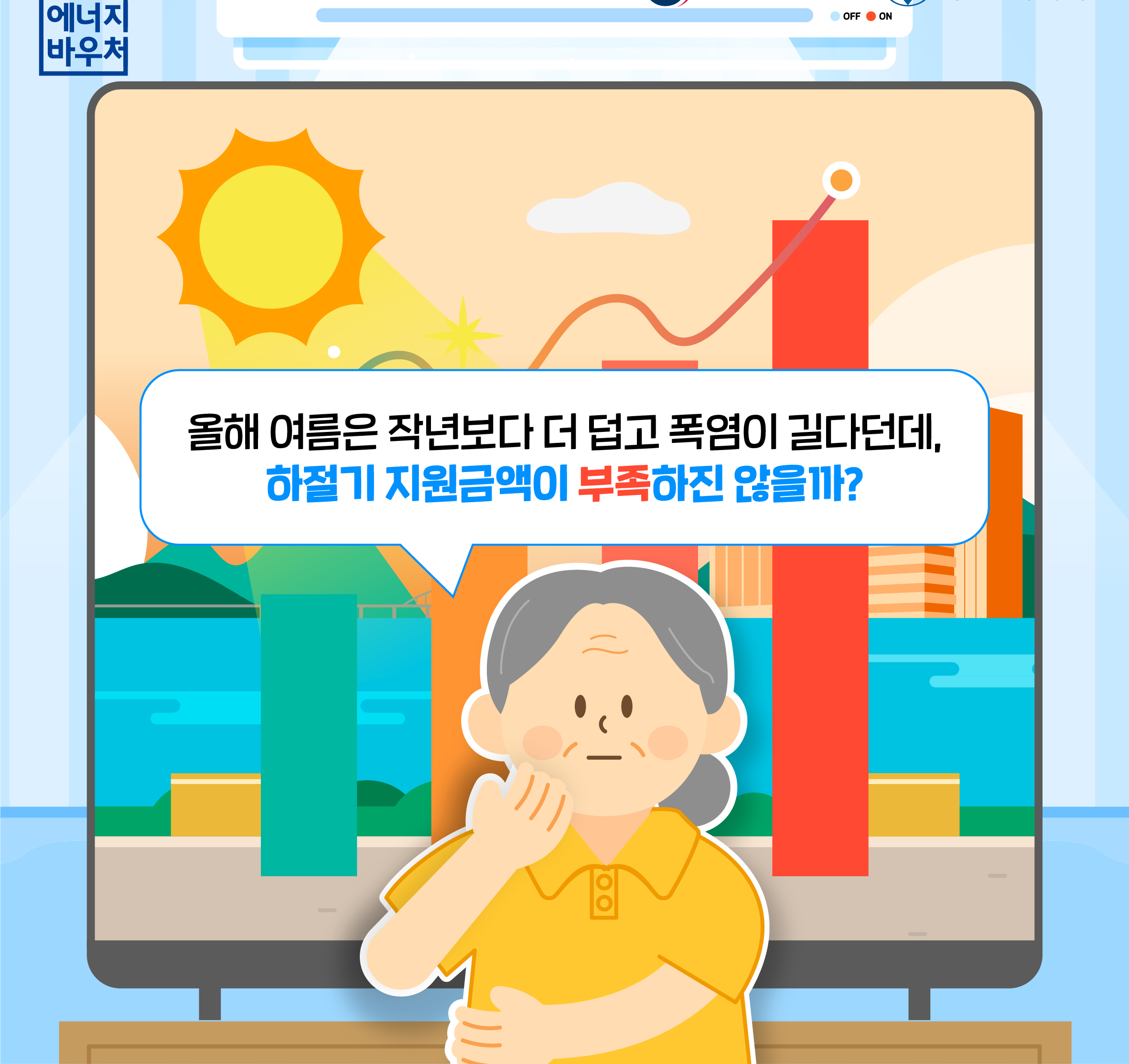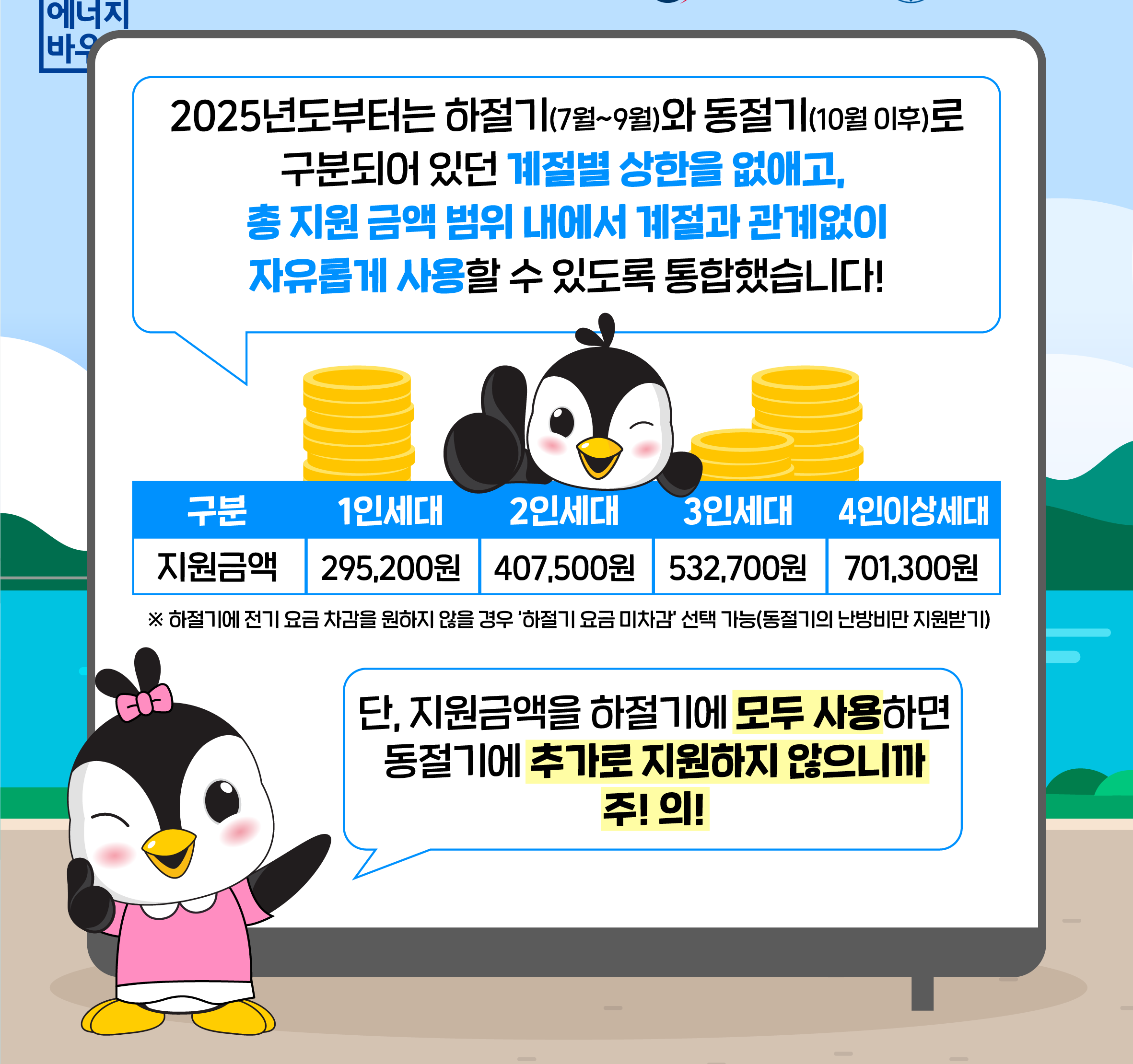 올해도 어김없이 무더운 여름과 추운 겨울이 찾아옵니다. 에너지 사용에 어려움을 겪는 분들이 이 제도를 통해 조금이나마 생활의 온기를 느낄 수 있기를 바랍니다. 자격이 되신다면, 망설이지 말고 신청하세요.
