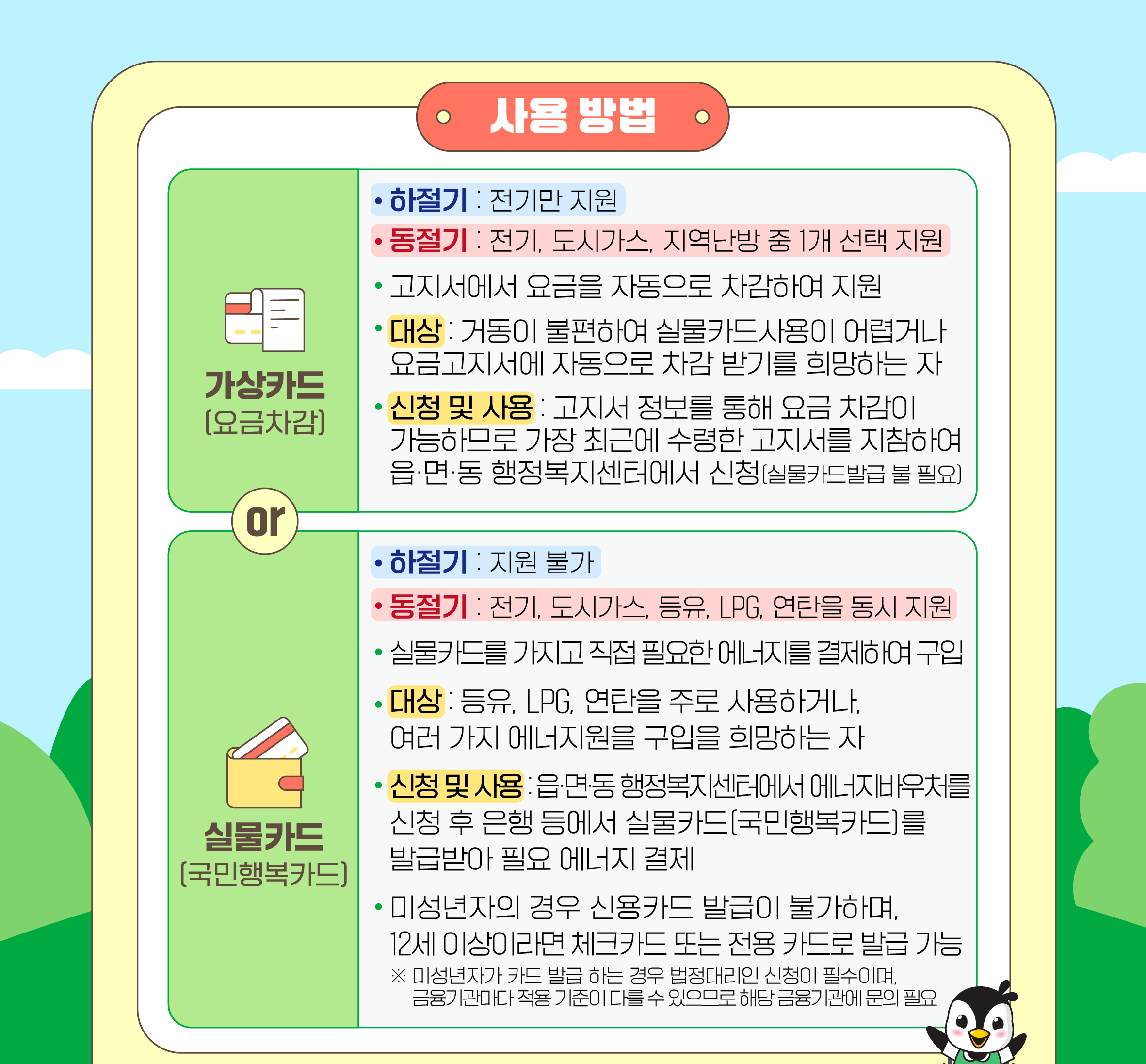 여름철인 하절기에는 7월 1일부터 9월 30일까지 전기요금에 한해 지원이 가능하며, 이는 가상 차감 방식으로 이루어집니다. 즉, 제출한 고지서상의 금액에서 자동으로 해당 금액이 차감됩니다. 겨울철인 동절기에는 선택에 따라 두 가지 방식으로 이용이 가능합니다. 전기, 도시가스, 지역난방 중 한 가지를 선택해 고지서에서 차감하는 가상 방식이 있고, 또 하나는 직접 결제가 가능한 실물 이용 방식입니다. 실물 방식은 국민행복카드를 통해 전기, 도시가스, 연탄, LPG, 등유를 결제할 수 있으며, 배달비도 포함해 사용할 수 있습니다.