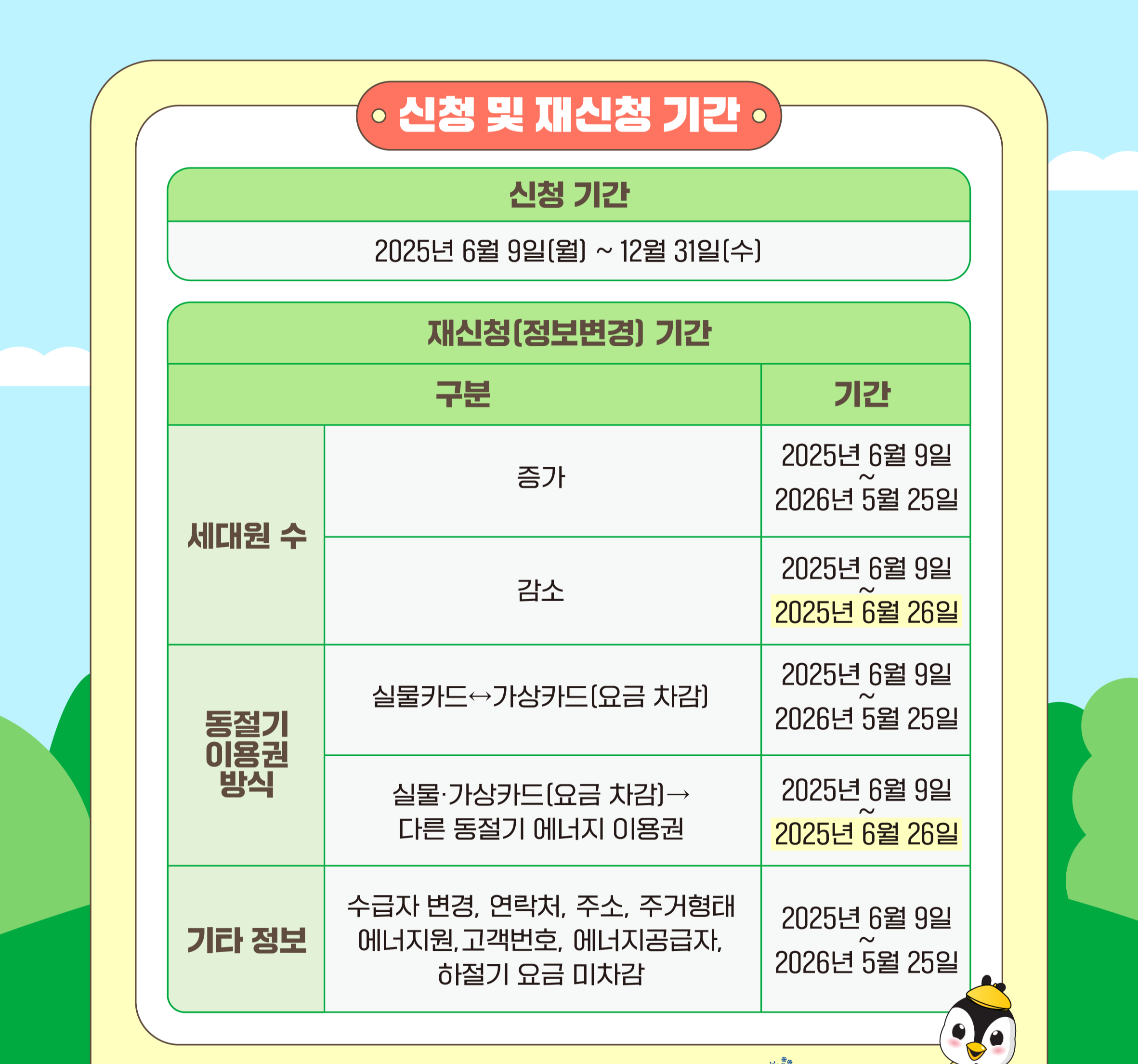 만약 신청 이후 가족 수가 달라졌거나, 동절기 이용 방식을 변경하고 싶거나, 주소나 연락처 같은 정보에 변동이 생겼다면 재신청 또는 정보 변경이 필요합니다. 이 경우에는 재신청 기간에 맞춰 수정하거나 다시 신청할 수 있습니다. 세대원 수가 늘어난 경우에는 2026년 5월 25일까지 변경 신청이 가능하고, 줄어든 경우에는 2025년 6월 26일까지 신청해야 합니다. 이용 방식이나 공급자, 고객번호 등 다양한 정보들도 같은 기간 동안 변경이 가능합니다.