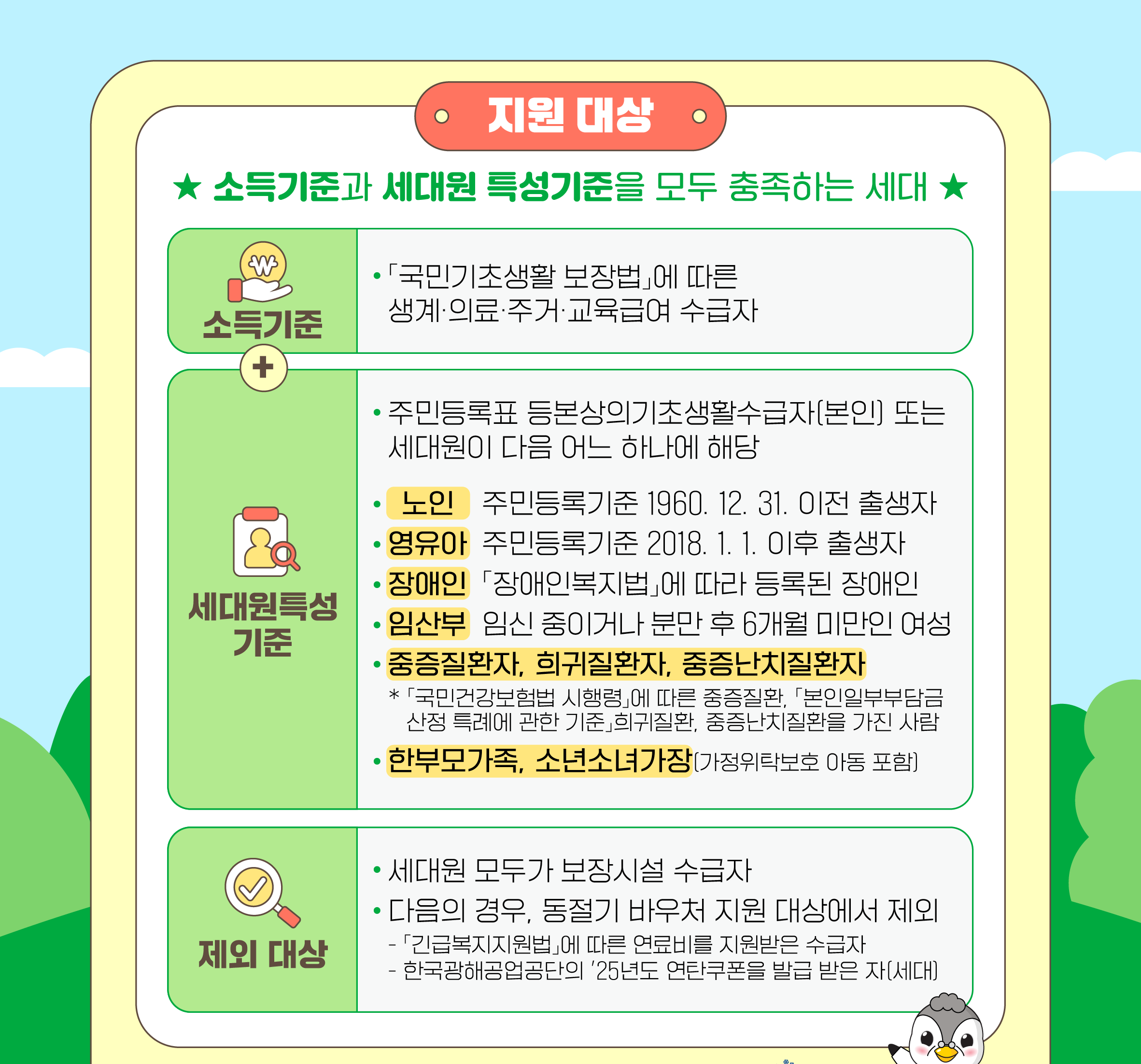 하지만 이것만으로는 부족합니다. 세대원 중 적어도 한 명은 특정한 특성 기준을 만족해야 합니다. 예를 들어 1960년 12월 31일 이전에 태어난 노인, 2018년 1월 1일 이후 출생한 영유아, 장애인복지법에 따라 등록된 장애인, 임신 중이거나 출산 후 6개월이 지나지 않은 여성 등이 해당됩니다. 또한 중증질환자, 희귀질환자, 중증난치질환자, 한부모가족, 소년소녀가장 또는 가정위탁보호 아동이 포함된 세대도 지원 대상이 됩니다.