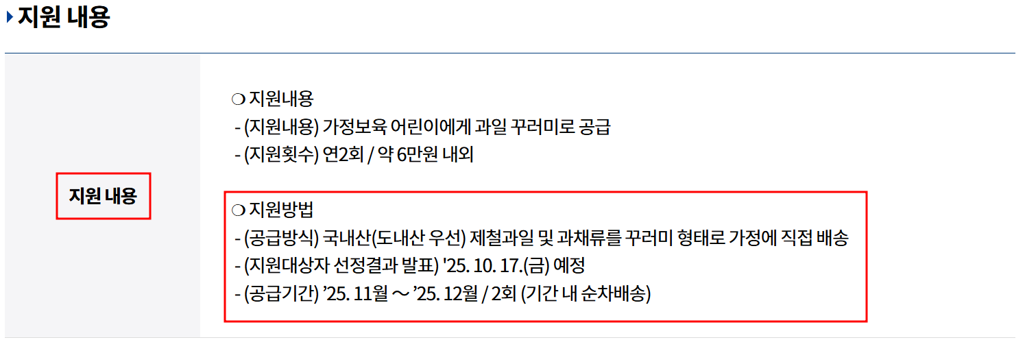 지원대상자 선정 결과는 2025년 10월 17일에 발표되며, 선정된 가정은 별도의 신청 절차 없이 해당 기간에 꾸러미를 받아볼 수 있다.