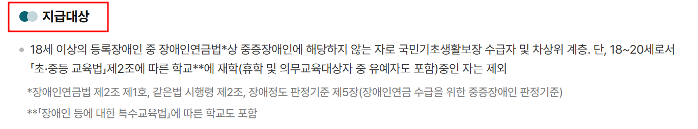 이 제도는 과거 장애등급제에 따라 1~6급으로 분류되던 장애인을 기준으로 하며, 현재는 장애 정도에 따라 중증과 경증으로 나누어 지원하고 있다.