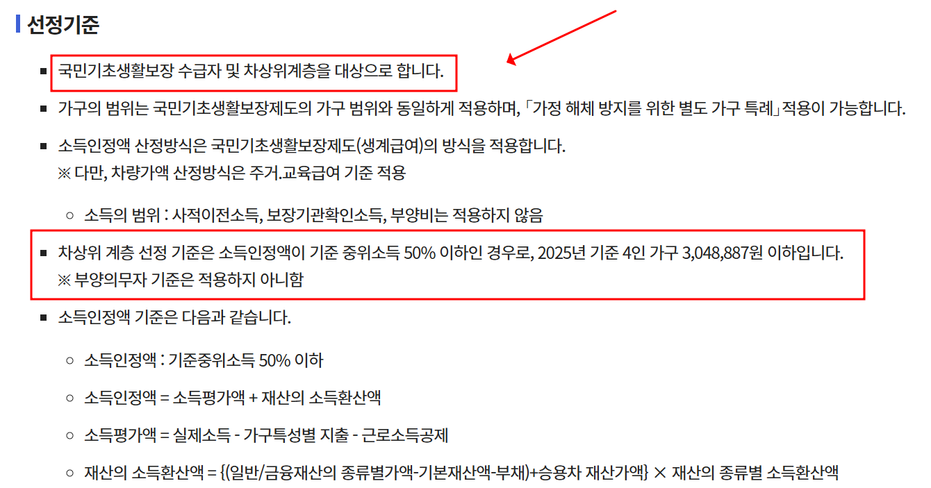 소득 기준은 가구의 소득인정액이 기준 중위소득 50% 이하이어야 한다. 소득인정액은 단순한 월 소득뿐만 아니라 재산을 소득으로 환산한 금액까지 포함하여 산정된다. 이에 따라 기초생활수급자 및 차상위계층이 주 대상이 된다.