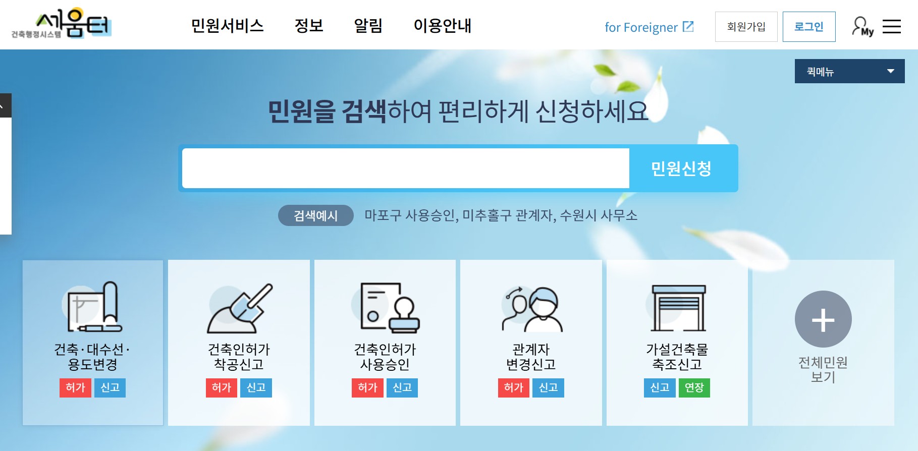 신축, 증축, 개축, 용도 변경 등 건축 관련 거의 모든 행정 절차를 온라인으로 신청할 수 있으며, 담당 공무원은 세움터를 통해 서류를 검토하고 보완을 요청할 수 있습니다. 신청인은 접수부터 최종 허가까지 진행 과정을 실시간으로 확인할 수 있어 불필요한 대기나 불안감을 줄일 수 있습니다.