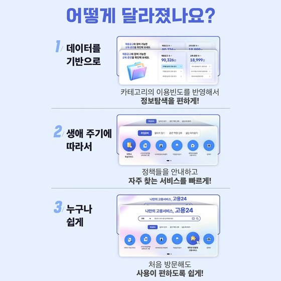 고용24의 가장 큰 변화는 데이터 기반 맞춤형 서비스와 생애 주기별 정책 안내입니다.
