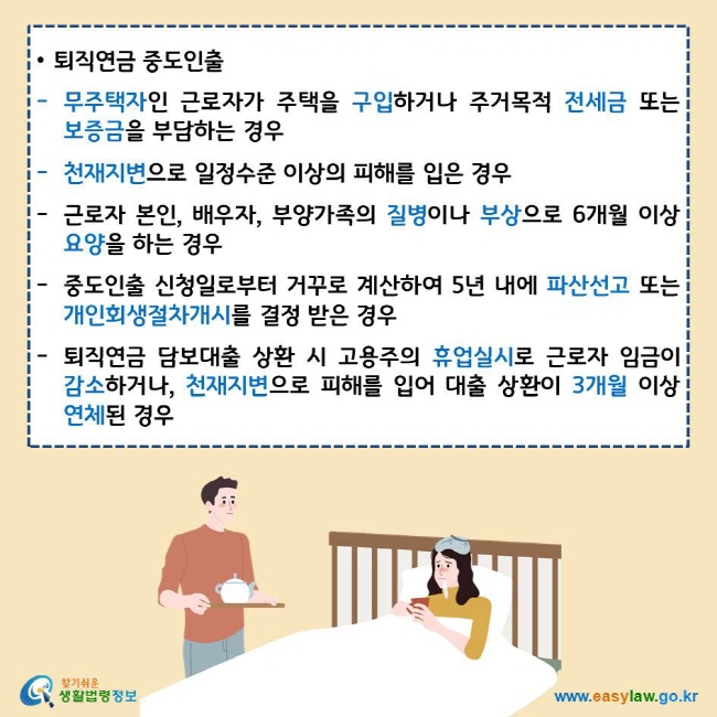 본인 또는 부양가족이 장기간 치료가 필요한 중대한 질병이나 부상을 당했을 경우, 치료비를 마련하기 위해 중간정산이 가능합니다.