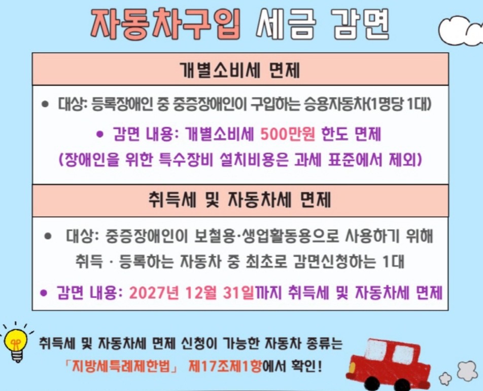 장애인 차량 구입 시 가장 큰 장점은 바로 세금 감면 제도입니다. 이는 초기 구입 비용을 크게 줄여주는 역할을 하며, 자동차를 소유하고 유지하는 과정에서도 경제적 부담을 덜어주는 핵심적인 지원 정책입니다.