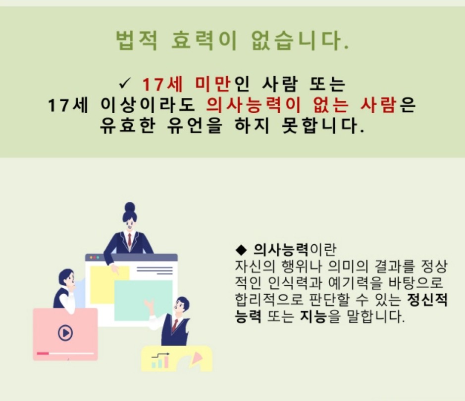 - 본인의 자유로운 의사로 작성해야 함 (강압·사기·착오는 무효)