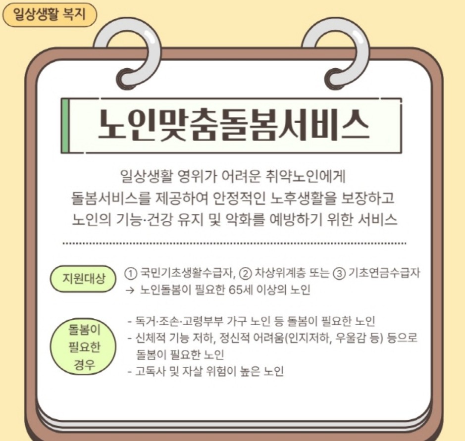 노인맞춤돌봄서비스는 만 65세 이상 어르신 가운데 혼자 생활하거나 일상적인 도움이 필요한 분들에게 제공되는 국가 지원 복지 제도입니다.