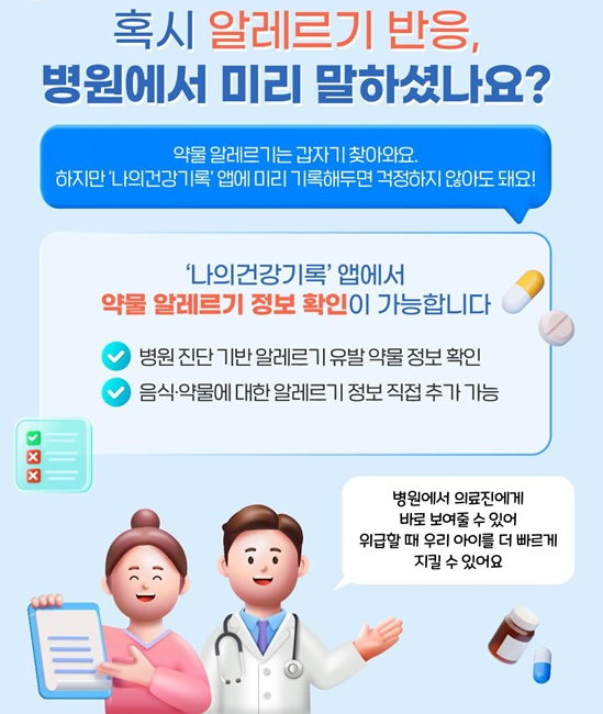 나의건강기록 앱은 약물 알레르기 정보를 사전에 등록해두고 언제든 확인할 수 있는 기능을 제공합니다.