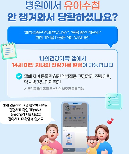 나의건강기록 앱은 만 14세 미만 자녀의 건강기록을 부모가 스마트폰으로 쉽게 열람할 수 있도록 돕습니다.