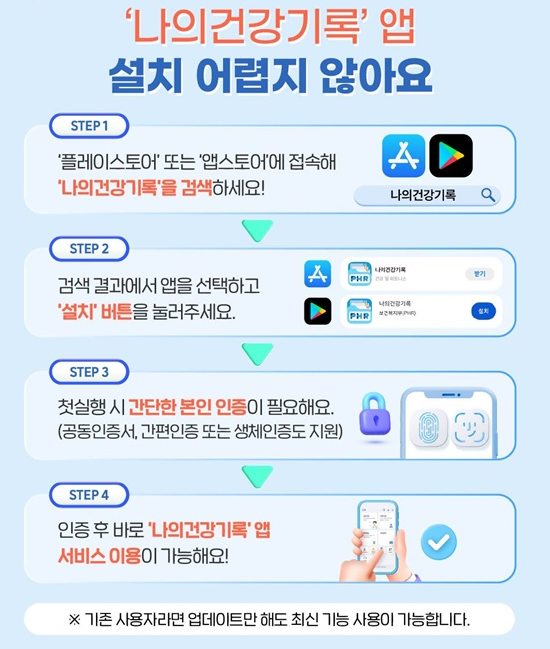 앱 설치는 스마트폰 사용자라면 누구나 손쉽게 진행할 수 있으며, 복잡한 절차 없이 간단한 인증만으로 모든 서비스를 이용할 수 있습니다. 아래 절차를 따라 실행하면 바로 건강기록 열람이 가능합니다.