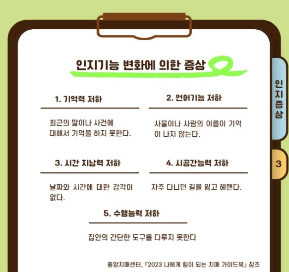 - 초기에는 단순한 건망증처럼 보일 수 있으나, 시간이 지남에 따라 기억력 저하가 뚜렷해지고 언어 능력, 계산 능력, 판단력, 공간 인지 능력 등이 차례대로 손상됩니다.