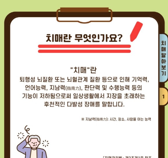 기억력, 언어 능력, 판단력, 공간 지각력 등 다양한 인지 기능이 전반적으로 손상되어 일상생활에 어려움을 주는 상태를 통틀어 치매라고 합니다. 따라서 치매는 증상의 집합이라는 점에서 이해하는 것이 옳습니다.