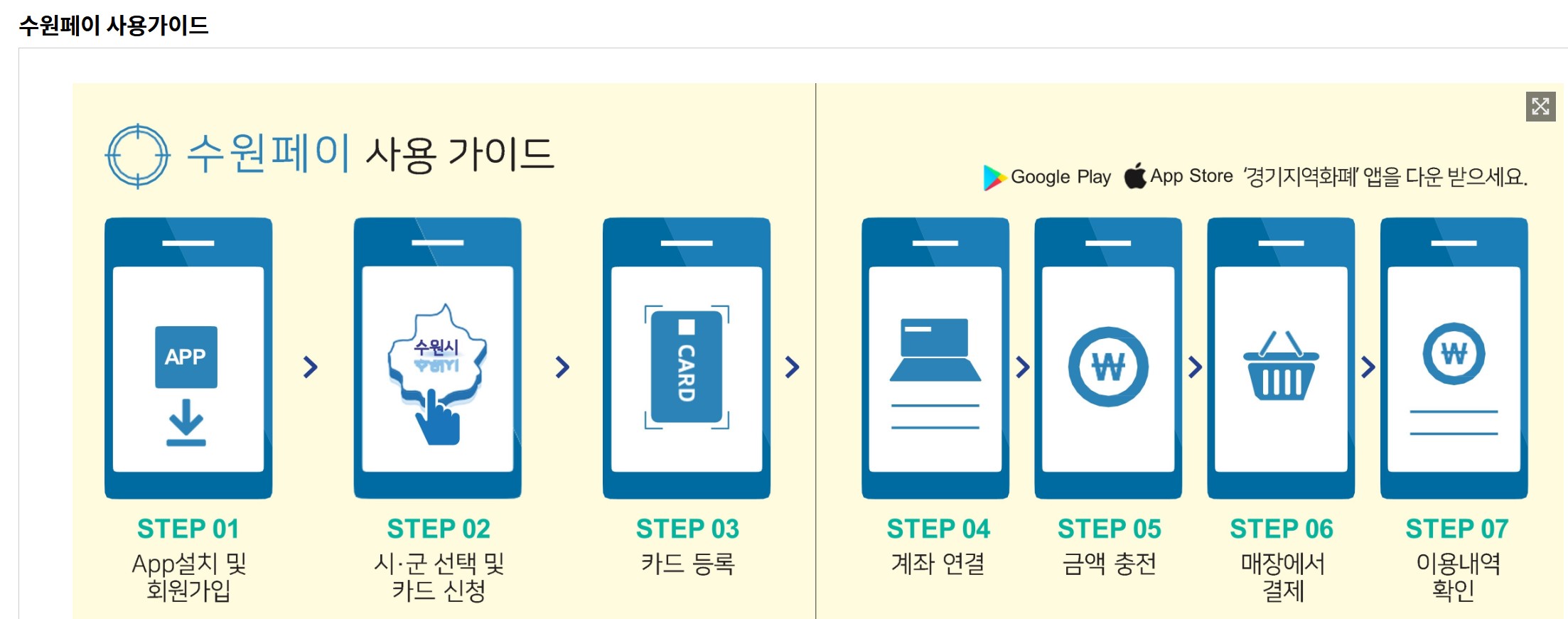 일반 결제 수단 처럼 전국 어디서나 사용 가능한 것이 아니라, 반드시 수원시 관내 가맹점에서만 사용이 가능합니다. 이는 의도적으로 소비를 지역 안에서 묶어두어 지역경제 선순환 구조를 만들기 위한 장치입니다.